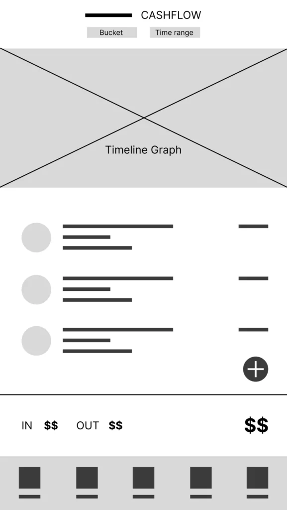 The cashflow page allows for a simple assessment of the user’s financial situation. It can be customized by time range (monthly by default) and financial bucket (e.g. credit card debt).